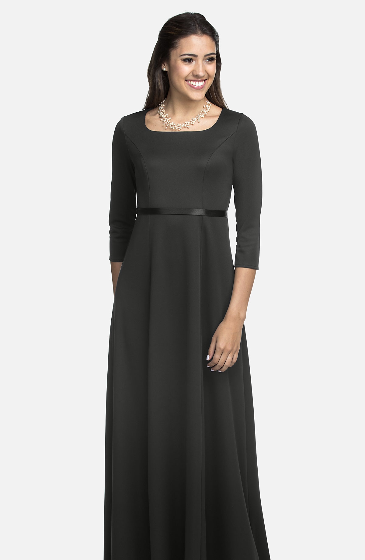 Black Performance Knit empire waist dress with princess lines featuring a large scoop neckline, 3/4 length sleeves and removeable satin belt at the waist create a perfect waistline everytime.