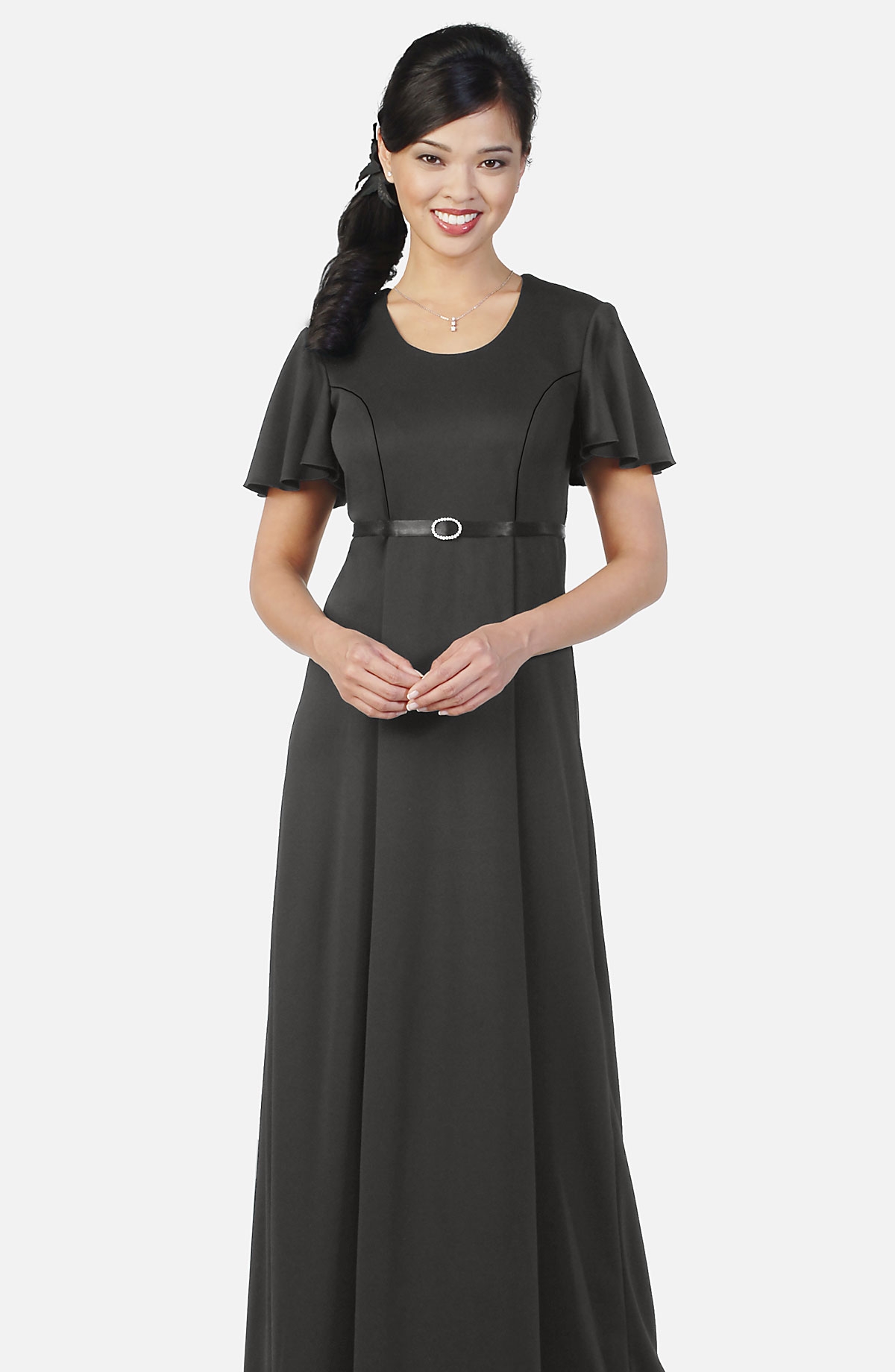 Black Performance Knit empire waist dress with princess lines featuring a small scoop neckline, bell sleeves and removeable satin belt at the waist create a perfect waistline every time.