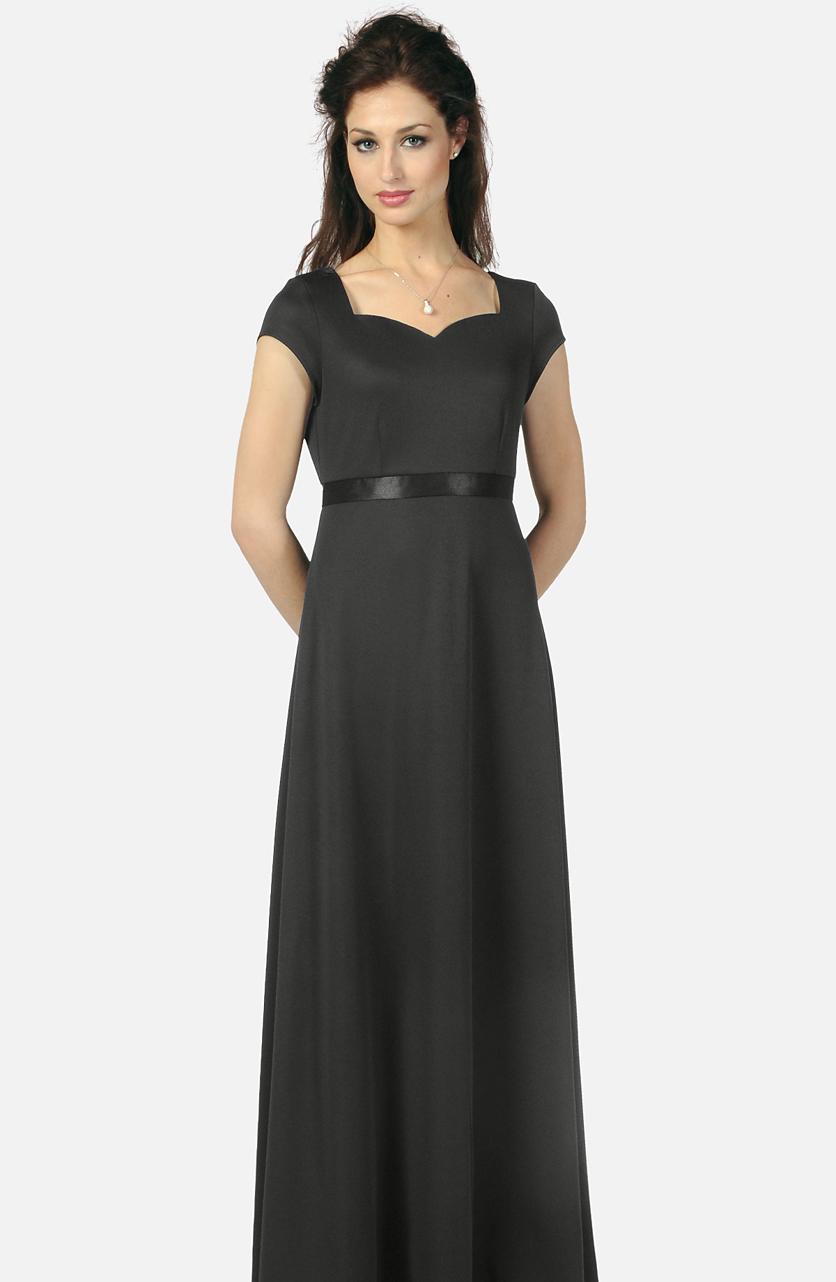 Black Performance Knit empire style dress featuring a sweetheart neckline and mini cap sleeves. A satin waist trim with sewn in sash ties create a perfect waistline every time.