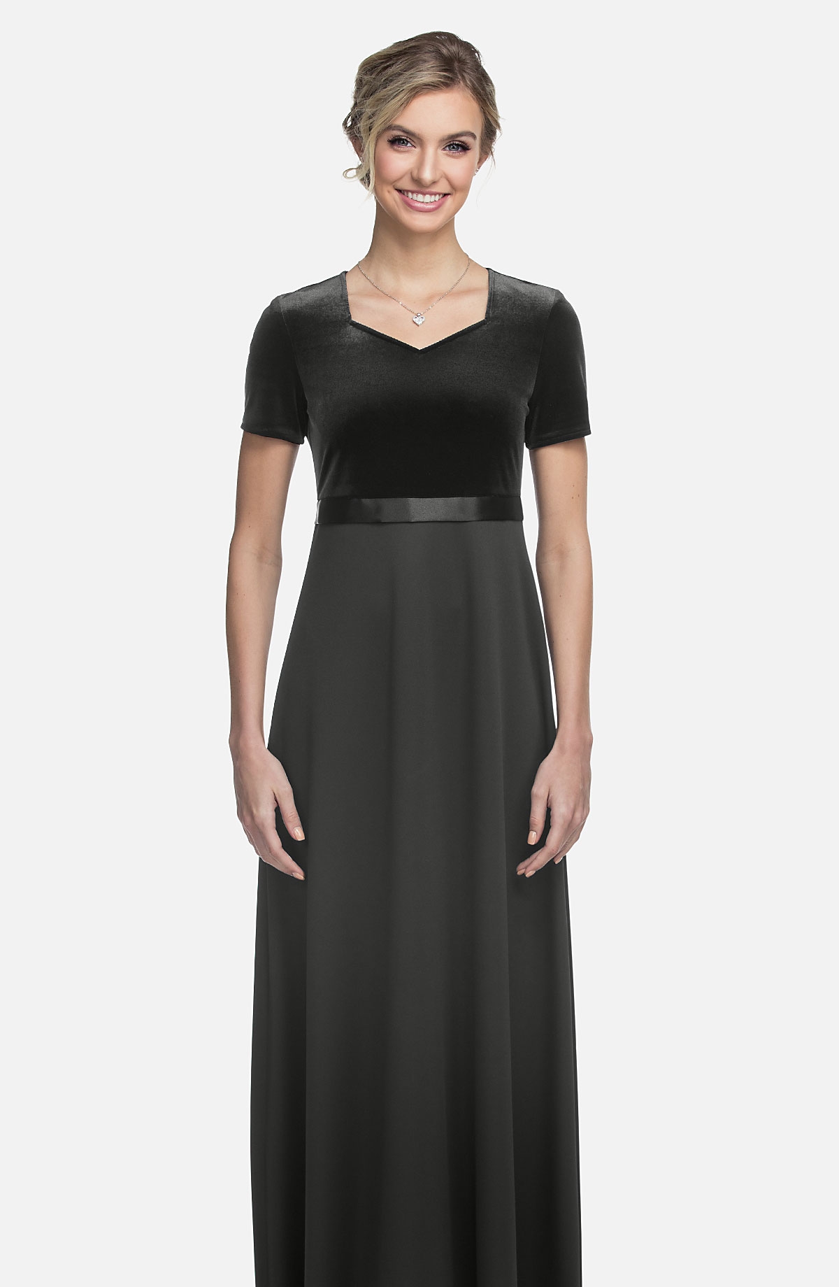 Black Stretch Velvet Bodice with Performance Knit skirt empire style dress with a softened V neckline and cap sleeves. A satin waist trim with sewn in sash ties create a perfect waistline every time.