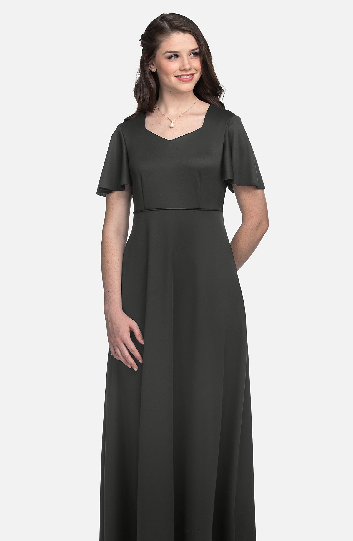 Black Performance Knit empire style dress featuring a softened V neckline and bell sleeves. Satin piping at the waist with sash ties create a perfect waistline every time.