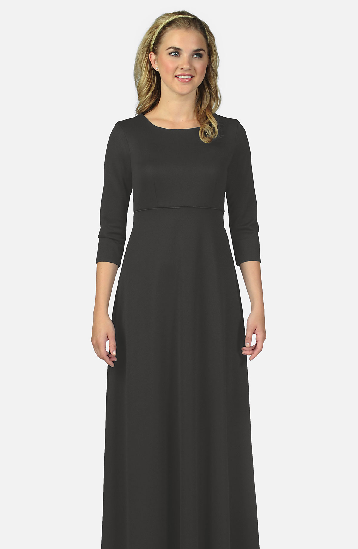 Black Performance Knit empire style dress featuring a round neckline and 3/4 length sleeves. Satin piping at the waist with sash ties create a perfect waistline every time.