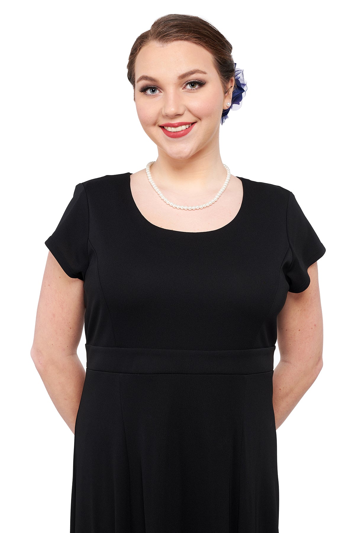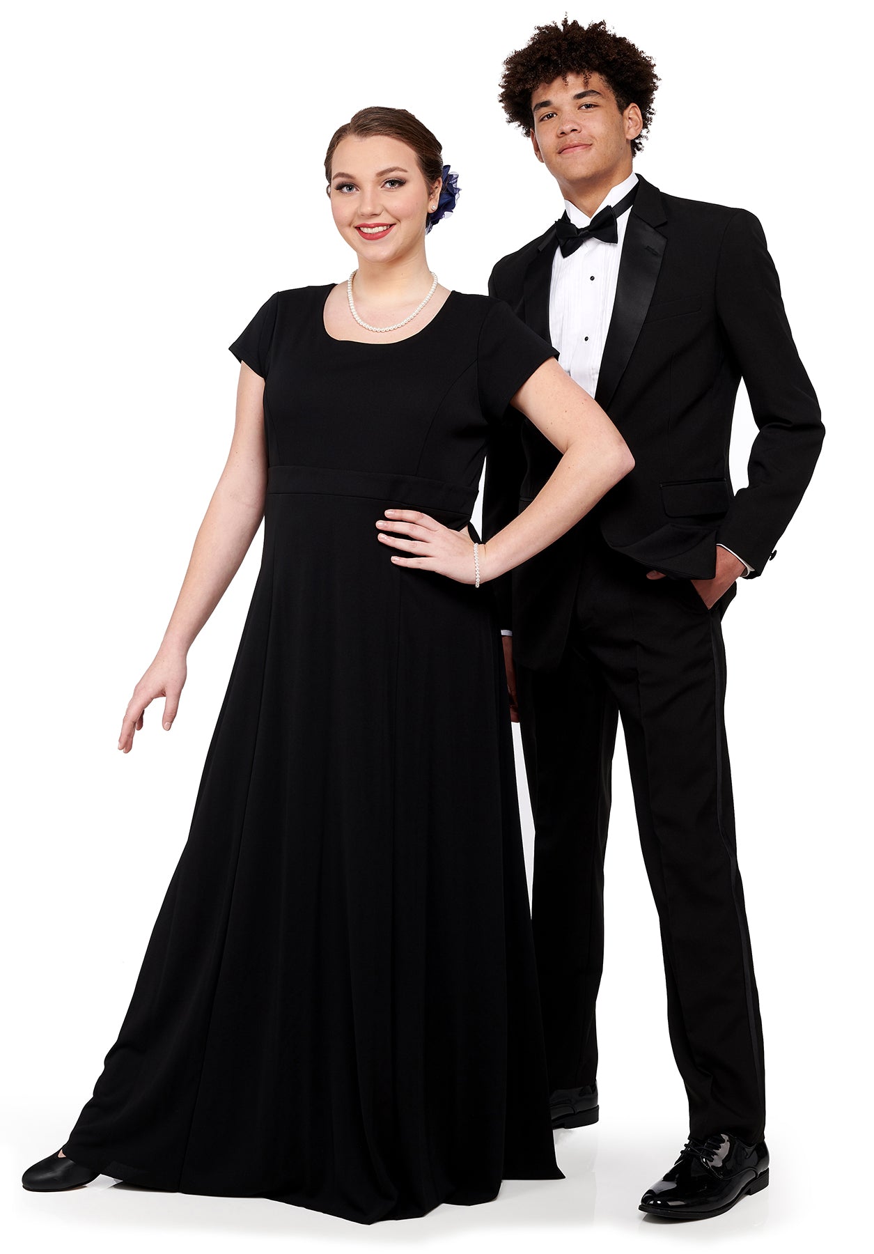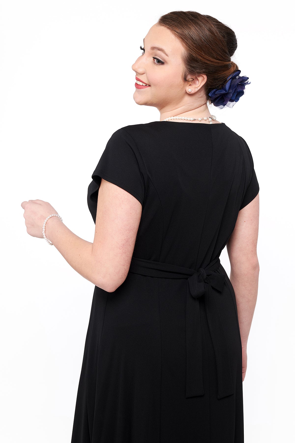 Scoop neck, cap sleeve, floor length gown with set-in-front empire waistband. Features back ties and no back zipper. Made in wrinkle resistant, easy care matte jersey stretch knit.