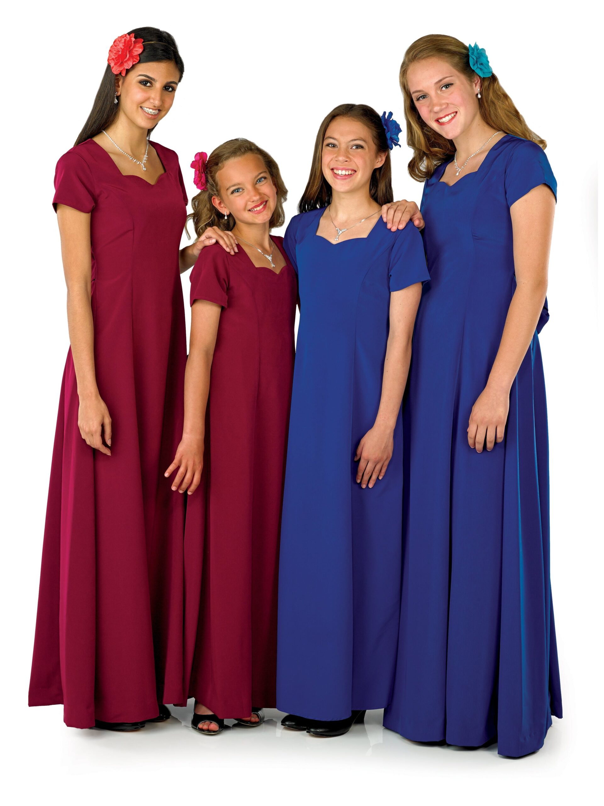 Sweetheart neck, short sleeve, floor length gown with princess seams. Features back ties and back zipper. Made in classic poly peach skin fabric.